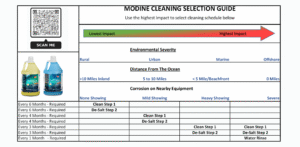 (d) Cleaning Schedule is defined as the required timeframe to perform routine heat exchanger coil cleanings as defined in the Modine Cleaning Selection Guide found below or at modinecoatings.com, (Minimum requirements are every six (6) months). Distance from ocean, environmental severity and visible corrosion at the site determines the required frequency and will be verified if required.